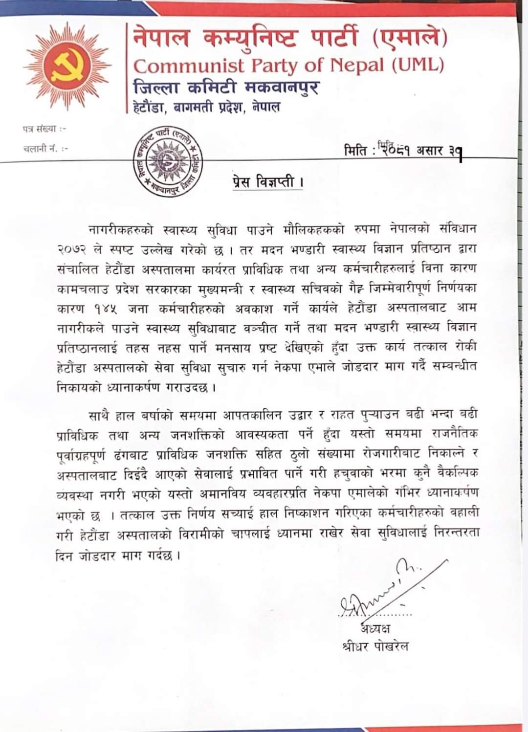 एमालेद्वारा हेटौंडा अस्पतालमा कर्मचारी कटौतीको विरोध