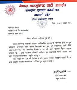 दलका प्रमुख सचेतक एकालाल श्रेष्ठले आइतबार सूचना जारी गर्दै साउन २७ गते मंगलबार दिउँसो ४ बजे बस्ने प्रदेशसभा बैठकमा अनिवार्य रूपमा उपस्थित भई मुख्यमन्त्रीको पक्षमा मतदान गर्न निर्देशन दिएका छन्। सोही दिन दिउँसो १ बजे दलको कार्यालयमा संसदीय दलको बैठक बस्ने भएकाले सबै सांसदलाई समयमै उपस्थित हुन सूचनामा उल्लेख गरिएको छ।