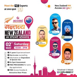 हेटौंडा/ विदेश अध्ययनसम्बन्धी परामर्श सेवा प्रदान गर्दै आएको Access Education ले हेटौंडामा ‘Gantabya New Zealand Event’ आयोजना गर्ने भएको छ। कार्यक्रम वैशाख १९ गते (शनिबार) बिहान १० बजेदेखि दिउँसो ३ बजेसम्म हेटौंडा–४, स्कूल रोडस्थित पुजन प्लाजामा रहेको Access Education को कार्यालयमा सञ्चालन हुनेछ।